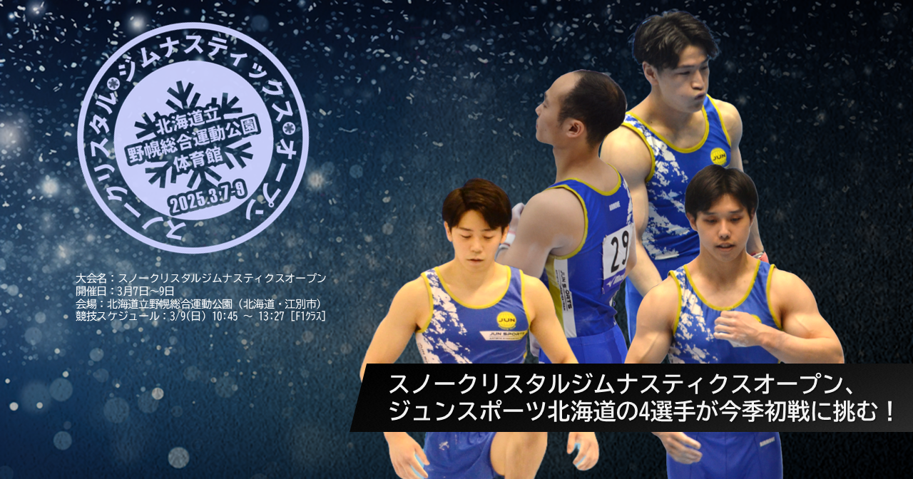 3月9日、ジュンスポーツ北海道の4選手が今季初の重要な試合、スノークリスタルジムナスティクスオープンに出場する。豊澤鉄平、前田航輝、青木翔汰、中川将径。この4名の選手たちは、全日本体操個人総合選手権への出場を決めており、スノークリスタルでの演技はその大きなステップとなる。