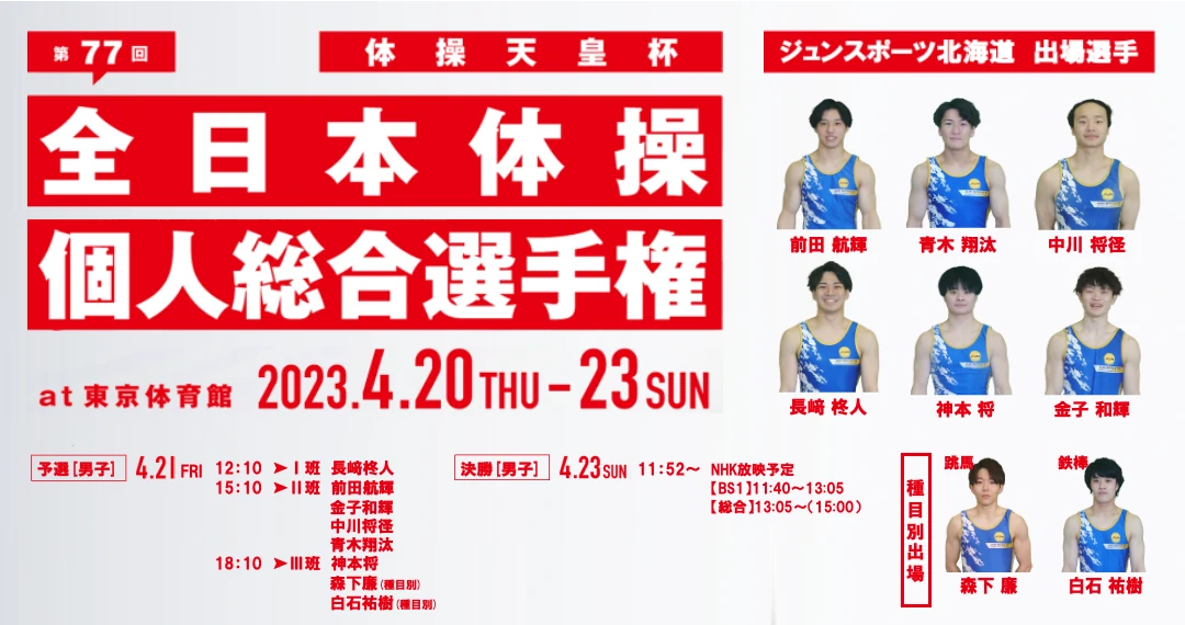 第77回全日本体操個人総合選手権が4月20日から23日にかけて、東京体育館(東京都渋谷区)で開催されます。ジュンスポーツ北海道からは、個人総合枠で前田航輝、青木翔汰、中川将径、長﨑柊人、金子和輝、神本将の6選手が出場します。種目別枠では、森下廉(跳馬)、白石祐樹(鉄棒)の2選手が出場します。