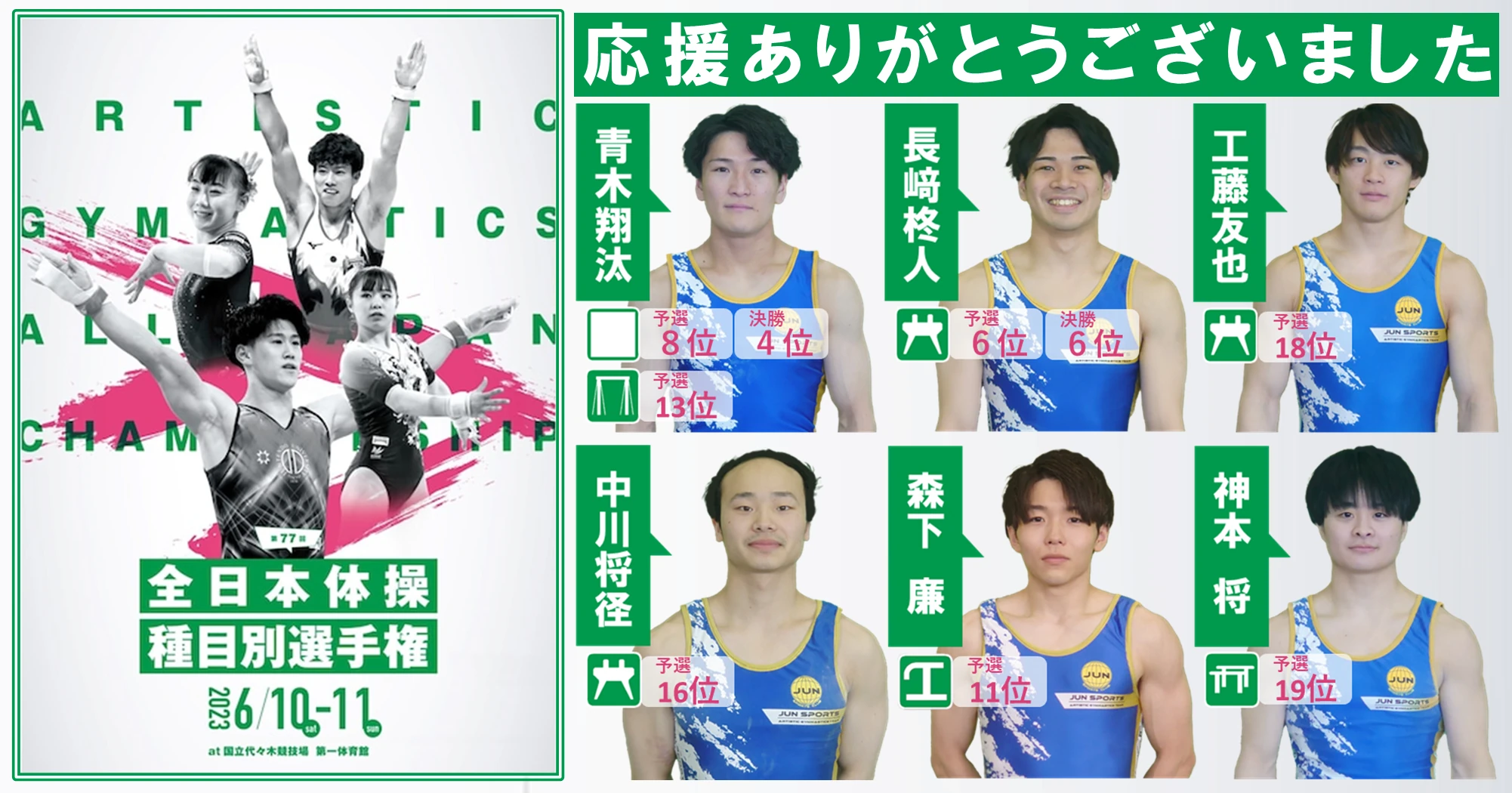 第77回全日本体操種目別選手権が、6月10日(土)-11日(日)国立代々木第一体育館で開催され、ジュンスポーツ北海道からは6名の選手が出場。青木(ゆか)、長﨑(あん馬)が10日に行われた予選を通過(上位8名)し2日目の決勝に進出。決勝では、青木がゆか4位。長﨑があん馬6位入賞を果たしました。