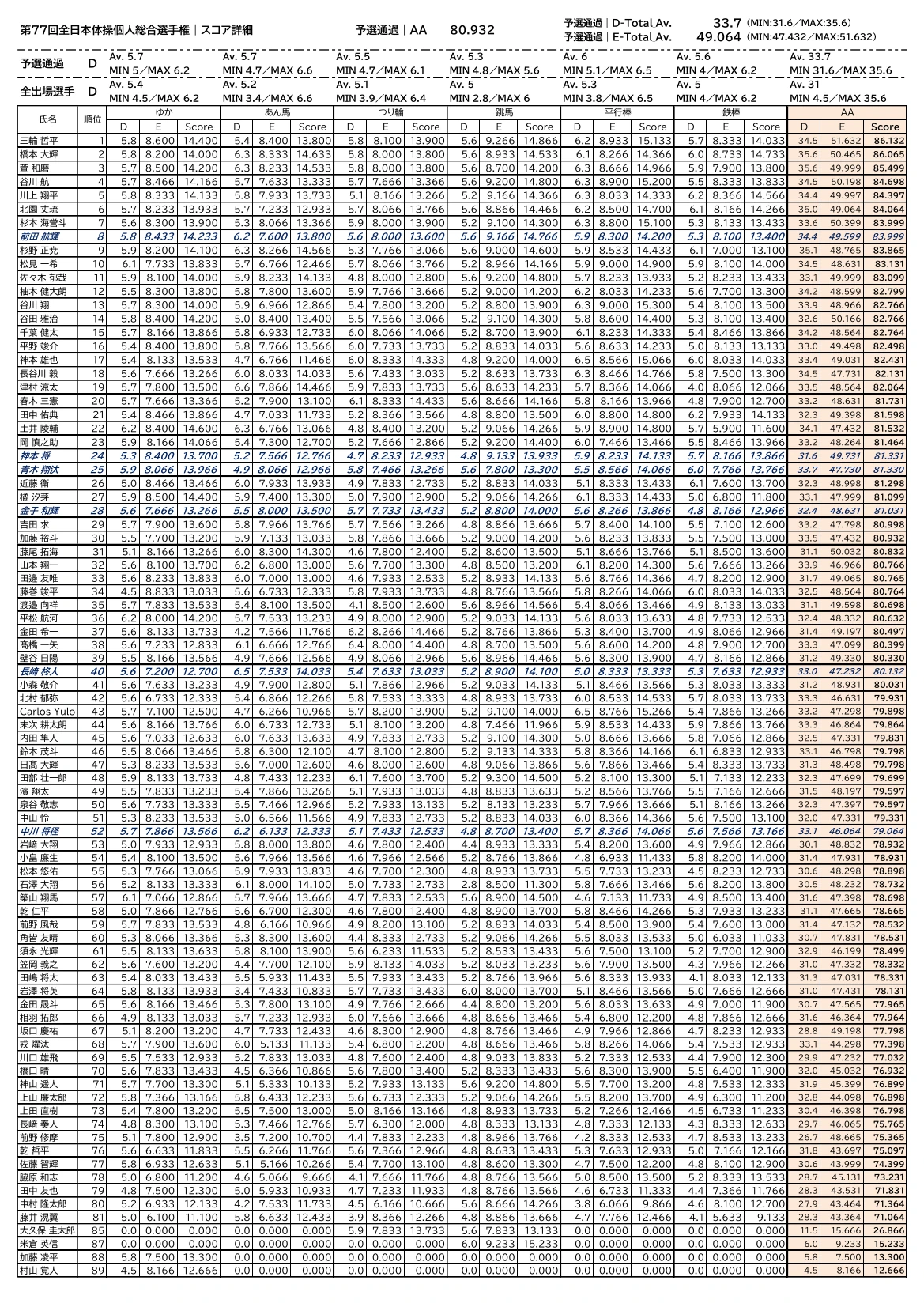 [参考データ:第77回全日本体操個人総合選手権|予選通過ライン]