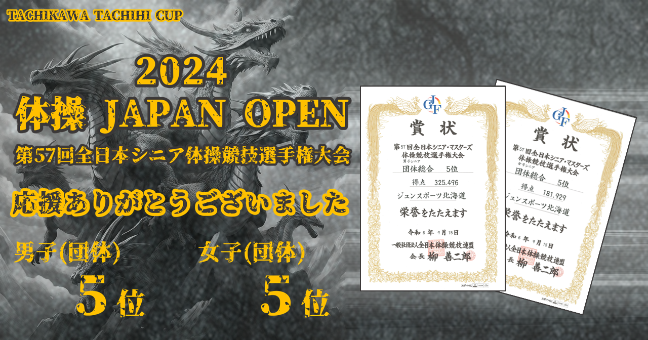 2024年9月15日(日)に東京都立川市で開催された「第57回全日本シニア体操競技選手権大会(TACHIKAWA TACHIHI CUP - 体操 JAPAN OPEN 2024)」において、ジュンスポーツ北海道の選手たちは奮闘し、男子・女子ともに団体で5位に入賞いたしました。